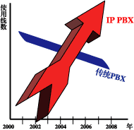 據(jù)美國“Yankee Group”預測,“2005年IP-PBX的使用線數(shù)將超過傳統(tǒng)PBX。從2001年開始傳統(tǒng)PBX以每年12%的速度在下降,IP-PBX以每年30%的速度增長”。