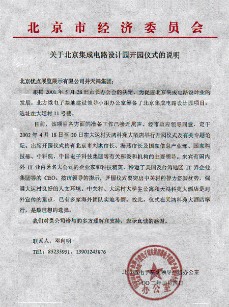 首屆呼叫中心運(yùn)營(yíng)管理研討會(huì)組委會(huì) 重要通告 本次大會(huì)組委會(huì)及會(huì)議舉辦地點(diǎn)“天鴻科園大酒店”日前接到北京市人民政府通知,由于“北京集成電路設(shè)計(jì)園開(kāi)園儀式”將于2002年4月18日至4月20日在大運(yùn)村、天鴻科園大酒店舉行開(kāi)園儀式及相關(guān)活動(dòng),屆時(shí)將有北京市劉淇市長(zhǎng)、海燕市長(zhǎng)及國(guó)家信息產(chǎn)業(yè)部、國(guó)家科技部、中科院、中國(guó)電子科技集團(tuán)等有關(guān)部委和機(jī)構(gòu)的主要領(lǐng)導(dǎo)出席。按市領(lǐng)導(dǎo)指示,為配合此次重大活動(dòng)圓滿舉行,“首屆呼叫中心運(yùn)營(yíng)管理研討會(huì)”日期更改為2002年4月23日至4月25日在北京天鴻科園大酒店舉行,望有關(guān)參會(huì)單位做好相應(yīng)的后續(xù)工作。特此通告! 組委會(huì)對(duì)有關(guān)參會(huì)單位的支持與配合表示真誠(chéng)的感謝。 首屆呼叫中心運(yùn)營(yíng)管理研討會(huì)組委會(huì)