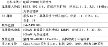 隨著思科無線IP電話7920的推出,思科公司為用戶提供了融合式無線解決方案和智能化的無線基礎(chǔ)設(shè)施,以及一款新產(chǎn)品,從而增強(qiáng)了IP通信在企業(yè)中發(fā)揮的作用。思科無線IP電話7920是一款方便易用的IEEE 802.11b無線IP電話,可以與Cisco CallManager和Cisco Aironet 1200、1100、350和340系列Wi-Fi(IEEE 802.11b)接入點(diǎn)配合,提供全面的語音通信功能。作為思科AVVID無線解決方案的一部分,思科無線IP電話7920可以在一個端到端的思科網(wǎng)絡(luò)中提供無縫的服務(wù),例如安全、移動、服務(wù)質(zhì)量(QoS)和管理。