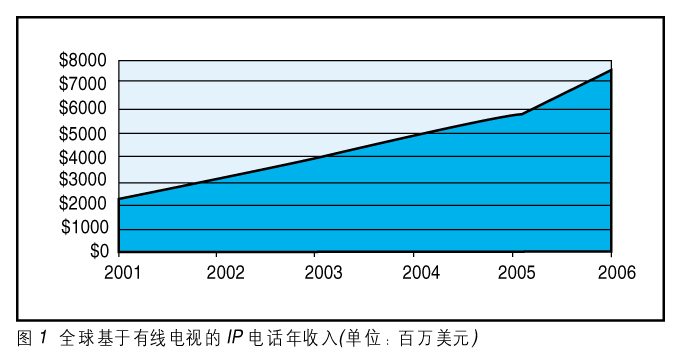 有線電視運營商在尋找使用有線電視基礎(chǔ)網(wǎng)絡(luò)HFC的新服務(wù),創(chuàng)造新的經(jīng)濟增長點,提供數(shù)據(jù)、語音、圖像綜合的服務(wù);谟芯電視系統(tǒng)的IP電話將是第一個最有可能推出的新服務(wù)。2002年InStat/MDR的分析報告說2006年基于有線電視的IP電話網(wǎng)將達到US$75億的年收入,如圖1所示。