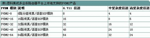 在任意思科集成多業(yè)務(wù)路由器平臺主板上使用任意思科PVDM2產(chǎn)品(PVDM2-8,PVDM2-16,PVDM2-24,PVDM2-32或PVDM2-64),可實現(xiàn)內(nèi)嵌模塊性,無需使用網(wǎng)絡(luò)模塊或AIM,即可提供會議、譯碼和話音端接。在思科集成多業(yè)務(wù)路由器中安裝思科PVDM2產(chǎn)品,可為IP話音流量和時分多路復用(TDM)流量提供這些服務(wù)。使用思科集成多業(yè)務(wù)路由器上本地安裝的VIC、VWIC或EVM(EVM僅在Cisco