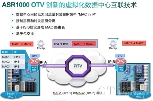 Cisco OTV技術(shù)可以為跨任意傳輸網(wǎng)絡(luò)的二層連接擴展,提供運營優(yōu)化型解決方案。因此,OTV對于分布式數(shù)據(jù)中心的高效部署發(fā)揮著關(guān)鍵作用,有助于實現(xiàn)應用可靠性和靈活的工作負載遷移。OTV是一項“MAC in IP”技術(shù)。通過使用MAC地址路由規(guī)則,OTV可提供一種疊加(overlay)網(wǎng)絡(luò),能夠在分散的二層域之間實現(xiàn)二層連接,同時保持這些域的獨立性以及IP互聯(lián)的容錯性、永續(xù)性和負載均衡優(yōu)勢。 圖1說明了這種工作機制。
