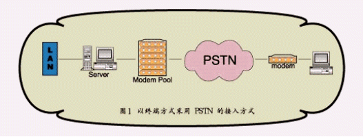 由于上述原因,遠程訪問技術(shù)長期以來一直使用一種最為普通、隨處可得的傳輸媒介——PSTN(公用電話網(wǎng))。利用Modem模擬撥號技術(shù)來實現(xiàn)遠程連接。利用PSTN進行遠程接入,用戶只要利用一條電話線和普通的Modem(調(diào)制解調(diào)器),對于用戶來說,一次性投入很小。當(dāng)然如果用戶想同時獲得數(shù)據(jù)服務(wù)和模擬的電話傳真服務(wù),就不得不再申請一個號碼,因為在這種通訊方式下,數(shù)據(jù)和模擬通訊均要求獨占一個信道。而企業(yè)需在局域網(wǎng)邊緣設(shè)置遠程訪問接入設(shè)備并配備一定數(shù)量的語音中繼線路供遠程訪問用戶撥入。如下圖所示: