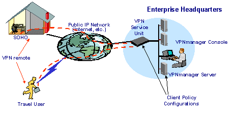 如上圖所示,企業(yè)網(wǎng)絡(luò)中心利用VPNManager建立全網(wǎng)的LDAP認(rèn)證目錄服務(wù)系統(tǒng)或使用RADIUS認(rèn)證系統(tǒng),當(dāng)遠程用戶接入本地的ISP之后需要訪問企業(yè)網(wǎng)內(nèi)部的資源時,安裝在移動用戶計算機上VPNremote Client即登錄網(wǎng)絡(luò)中心的LDAP服務(wù)器或RADIUS服務(wù)器進行驗證工作,通過后即可訪問相應(yīng)權(quán)限的資源。然后遠程主機通過Internet發(fā)送加密信息到企業(yè)網(wǎng)絡(luò)中心的VPN設(shè)備;當(dāng)數(shù)據(jù)包到達目標(biāo)VPN設(shè)備時,數(shù)據(jù)包被解封裝,數(shù)字簽名被核對無誤后數(shù)據(jù)包被解密。