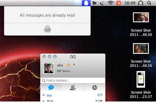現(xiàn)在你可以在Mac通知欄看到一個QQ圖標,點擊圖標可以看到所有QQ消息。