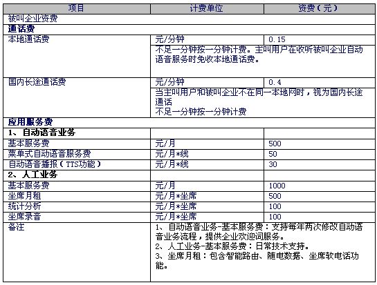 2、被叫企業(yè)資費(fèi)標(biāo)準(zhǔn)如下: