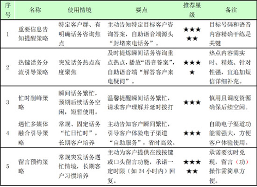 。1)策略內(nèi)容:突發(fā)話務(wù)往往導(dǎo)致瞬間話務(wù)高峰,如能將瞬間話務(wù)“均衡化”,則可有效避免“話務(wù)雪崩”,為此通過錄制IVR語音,引導(dǎo)客戶閑時再撥!臼纠俊白鹁吹目蛻,目前人工話務(wù)繁忙,為節(jié)省您的時間,建議您4小時后再行撥打。給您帶來不便,我們深表歉意”。