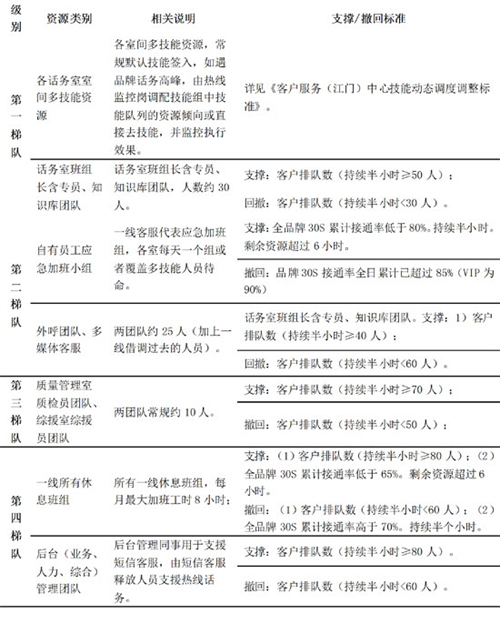 第一梯隊:側(cè)重現(xiàn)有話務(wù)科室間“技能協(xié)同”,適度放棄某些品牌,重點保障某品牌;同時一線班組長和日常負責(zé)業(yè)務(wù)知識管理的同事入線,承接普通話務(wù)。