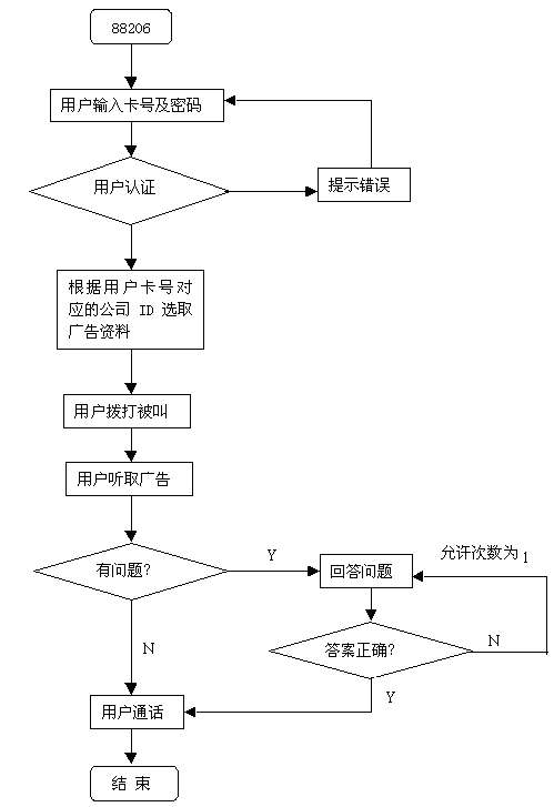 4)可設(shè)置廣告廠家的客戶服務(wù)中心電話,如電話用戶需要,可將其與該電話連通,同時(shí)在卡上計(jì)費(fèi),費(fèi)率按本地到該通達(dá)地區(qū)計(jì)算。