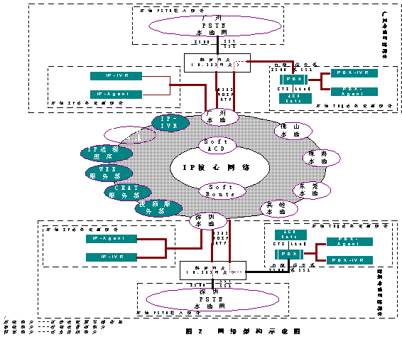 從網(wǎng)絡(luò)架構(gòu)示意圖2中可以看到,每一個(gè)PSTN本地網(wǎng)都是通過(guò)H323媒體網(wǎng)關(guān)連接到IP包交換網(wǎng)絡(luò),再接入到呼叫中心系統(tǒng)中來(lái)的,包括廣東省內(nèi)各個(gè)比較重要的城市(如深圳,珠海,中山,東莞等等)都可以設(shè)一個(gè)H323媒體網(wǎng)關(guān).同時(shí)所有的話(huà)務(wù)資源(如多媒體座席和IP-IVR系統(tǒng))都是直接通過(guò)IP網(wǎng)絡(luò)連接到呼叫中心系統(tǒng)中來(lái)的.