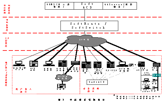 話(huà)務(wù)資源接入層―――所有的話(huà)務(wù)資源包括IP多媒體座席,IP-IVR(基于VOIP的IVR系統(tǒng)),聊天和WEB服務(wù)器,IP-IFR(基于VOIP的IFG系統(tǒng)),視頻服務(wù)器等,還包括通過(guò)VOIP網(wǎng)關(guān)和TDM