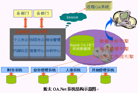 新太OA.NET系統(tǒng)采用B/S結(jié)構(gòu)設(shè)計,系統(tǒng)以提供大量快速靈活的自定義功能以及許多核心平臺產(chǎn)品,如協(xié)同工作平臺、通訊平臺、知識管理平臺、信息服務(wù)平臺等,能夠幫助用戶快速實施信息化建設(shè),OA.NET系統(tǒng)的最大特色是實現(xiàn)"零代碼"維護功能,系統(tǒng)安裝后,無需編寫任何代碼就可生成各種辦公業(yè)務(wù)應(yīng)用,用戶只需幾個小時的培訓(xùn)就可以使用OA.Net提供的工具進行復(fù)雜辦公流程的設(shè)計,并且可以不需要經(jīng)過任何編碼的改動,就能輕松適應(yīng)流程變化的新情況。另外,OA.NET強調(diào)對企業(yè)內(nèi)部知識的有效管理和有效利用,能夠沉積企業(yè)日常的零散信息,并通過有序歸類的方式使之成為對企業(yè)有用的知識。OA.Net還提供了功能強大的個性化配置功能,每個員工都可以定制自己的界面風(fēng)格和功能模塊,并且可以自己建立個人的應(yīng)用環(huán)境,滿足個人的喜好。OA.Net包含了新太自主開發(fā)的業(yè)務(wù)工作流處理引擎,能夠在不用編寫代碼的情況集成其他業(yè)務(wù)系統(tǒng),實現(xiàn)了業(yè)務(wù)系統(tǒng)中的數(shù)據(jù)和辦公流程的完美結(jié)合,使得辦公應(yīng)用系統(tǒng)真正成為企業(yè)內(nèi)部的廣義化辦公門戶。