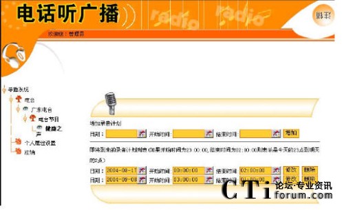 定制自動(dòng)聽廣播的目的是:用戶設(shè)定的時(shí)間到達(dá)時(shí),由系統(tǒng)主動(dòng)呼叫用戶所定制的電話,用戶摘機(jī)即可收聽到所定制的廣播節(jié)目內(nèi)容。用戶要獲取該自動(dòng)服務(wù)的前提是,必須預(yù)先定制好外呼時(shí)間、外呼電話和廣播內(nèi)容。