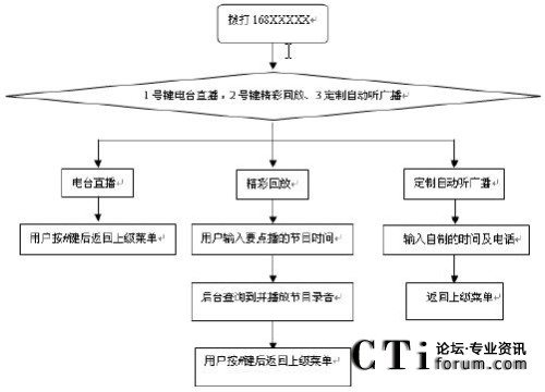 用戶使用時(shí)可通過固定話機(jī)、小靈通或手機(jī)撥叫業(yè)務(wù)特號進(jìn)入系統(tǒng),根據(jù)系統(tǒng)的語音提示按鍵選擇收聽不同的電臺節(jié)目,在收聽廣播的過程中,可按下電話機(jī)上的#字鍵返回上級菜單提示音,以滿足用戶在收音過程中需要不斷調(diào)換頻道的要求。