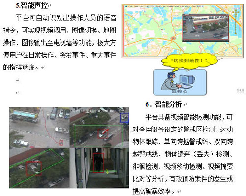 由于海量視頻信息的出現(xiàn),要求平臺能利用智能視頻技術(shù)來解決傳統(tǒng)視頻監(jiān)控系統(tǒng)所無法解決的問題。如智能檢索、人臉識別、車牌識別、運動軌跡跟蹤、行為模式分析等,變“被動監(jiān)控”為“主動監(jiān)控”,以提升視頻監(jiān)控系統(tǒng)的應(yīng)用成效,降低管理成本。