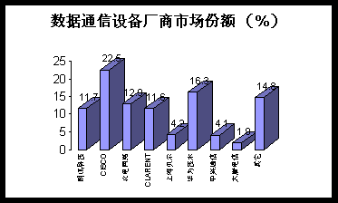 (1)市場規(guī)模: 年初各大運營商IP實驗網(wǎng)的開通以及聯(lián)通覆蓋300余城市的IP網(wǎng)絡(luò)大規(guī)模建設(shè),年中ChinaNet大提速與3期擴容項目實施以及CNCnet開通,年末CMnet骨干網(wǎng)一期工程上馬、2000年中國數(shù)據(jù)通信設(shè)備市場可謂是熱點頻仍。根據(jù)Frost&Sullivan分析,年內(nèi)網(wǎng)絡(luò)交換機、訪問產(chǎn)品、 路由器、集線器等數(shù)據(jù)通信主要設(shè)備市場規(guī)模達(dá)到96億人民幣,同比增長36%,數(shù)據(jù)通信設(shè)備市場再次進(jìn)入高速增長期。