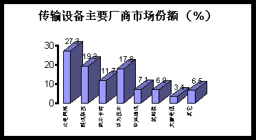 (3)市場發(fā)展及預(yù)測:2001年城域網(wǎng)絡(luò)、接入網(wǎng)絡(luò)等光網(wǎng)絡(luò)建設(shè)的加速,將推動傳輸設(shè)備市場保持25%以上的增長。 更多的非外資廠商預(yù)計在高端傳輸設(shè)備領(lǐng)域取得突破,相關(guān)設(shè)備價格可能同比降低12%以上。傳統(tǒng)傳輸設(shè)備市場加速萎縮、DWDM等光傳輸技術(shù)與設(shè)備將成為市場中的壟斷力量。