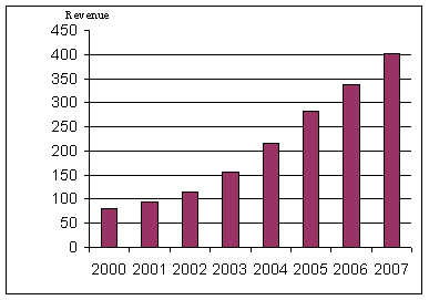 圖1表明了2000年至2007年亞太新一代移動網絡市場的收入與增長。