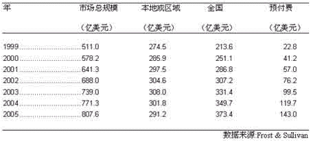 本地或區(qū)域價格方案在我們預測的時期內, 將始終是手機用戶采納的最多的一種方案。 1999年,在美國有5千7百 萬,大約70%的用戶是采用本地或區(qū)域方案, 而該方案產生的營業(yè)額為274.5億美元, 約占市場總規(guī)模的58.6%。Frost & Sullivan 預計,到2005年, 46.6%的手機用戶還會使用該種方案, 而該方案產生的營業(yè)額將為291.2億美元,占市場總規(guī)模的比例將縮至36.1%。