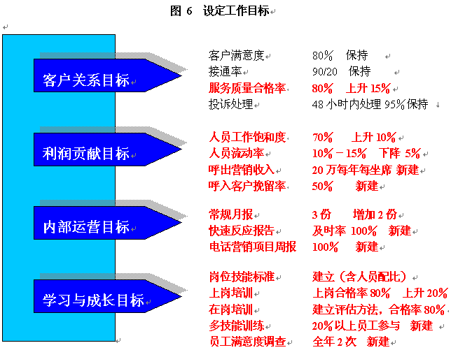 | 1 | 分4批招聘100位新員工,滿足話務(wù)量增長的需要 | 接通率90% 上崗合格率80% 工作飽和度70% |