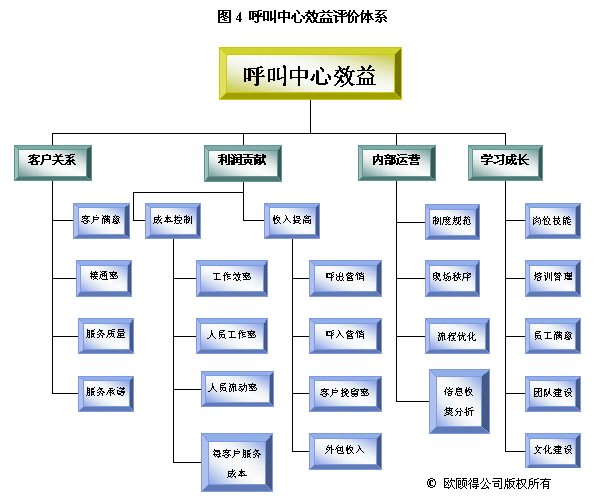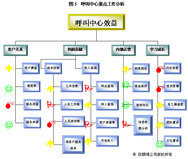 根據(jù)年度重點(diǎn)工作及目標(biāo),我們就可以設(shè)計(jì)關(guān)鍵措施來使其實(shí)現(xiàn)。通常一項(xiàng)關(guān)鍵措施可以有助于幾個目標(biāo)的達(dá)成。如建立培訓(xùn)體系,可以使得在崗培訓(xùn)、上崗培訓(xùn)、多技能訓(xùn)練以及崗位技能達(dá)標(biāo)率有所提升,而體現(xiàn)在業(yè)務(wù)上的效果則是服務(wù)質(zhì)量的提升、呼出營銷收入增加和客戶挽留率提高。