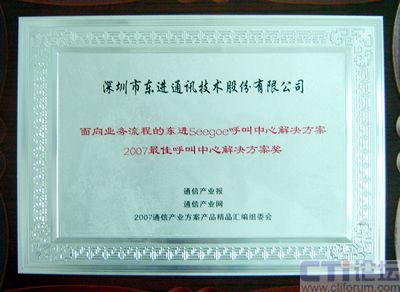 10月23日,中國國際通信設(shè)備技術(shù)展覽會國際通信展覽會開幕當天,由通訊產(chǎn)業(yè)報社主辦的2007通信產(chǎn)業(yè)方案產(chǎn)品精品評選活動頒獎典禮隆重舉行,東進技術(shù)的“面向業(yè)務(wù)流程的東進Seegoe呼叫中心解決方案”榮獲2007最佳呼叫中心解決方案獎。