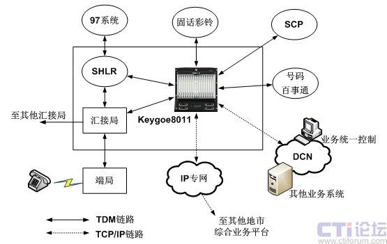 東進(jìn)Keygoe系列多媒體交換機(jī)通過高密度7號信令鏈路支持、大容量的時隙交換、多網(wǎng)絡(luò)接口和語音處理完成不同業(yè)務(wù)系統(tǒng)的7號信令的接續(xù)和解析、話音交換和協(xié)議轉(zhuǎn)換。對于已經(jīng)進(jìn)行固網(wǎng)智能改造的電信網(wǎng)絡(luò),可以在匯接局將各種業(yè)務(wù)平臺連接至東進(jìn)Keygoe系列多媒體交換機(jī),并通過東進(jìn)Keygoe系列多媒體交換機(jī)連接至SHLR,實(shí)現(xiàn)多業(yè)務(wù)平臺上的多業(yè)務(wù)觸發(fā),同時通過SHLR與97系統(tǒng)以及其他業(yè)務(wù)支撐系統(tǒng)連接起來,實(shí)現(xiàn)業(yè)務(wù)的統(tǒng)一批價、鑒權(quán)和計費(fèi);對于沒有進(jìn)行固網(wǎng)智能化改造的電信網(wǎng)絡(luò),可以在匯接局通過東進(jìn)Keygoe系列多媒體交換機(jī)和SSP提供基于TCP/IP層面的業(yè)務(wù)平臺互聯(lián)。