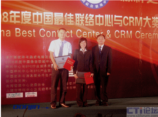 “2008中國最佳聯(lián)絡中心及CRM評獎”是由中國唯一的國家級呼叫中心與BPO行業(yè)協(xié)會--中國呼叫中心與BPO產(chǎn)業(yè)聯(lián)盟(CNCBA) 與呼叫中心與BPO行業(yè)資訊網(wǎng)(51 Callcenter)、中國軟件與服務外包產(chǎn)業(yè)聯(lián)盟共同主辦,代表中國唯一接軌全球最佳聯(lián)絡中心評選標準,是工業(yè)和信息化部唯一認可的行業(yè)獎項,為真正意義上的中國聯(lián)絡中心“奧斯卡”獎。參選對象為中國行政區(qū)域內(nèi)的各類政府、企事業(yè)單位聯(lián)絡中心、客戶服務中心、客戶支持中心、客戶聯(lián)絡中心、以及同類含義的職能部門及其從業(yè)人員等。因此,無論是從獎項的規(guī)格還是入選的圍度都是非常高規(guī)格與嚴格的。東進技術(shù)的多媒體呼叫中心系統(tǒng)平臺解決方案在此次評選中經(jīng)過了用戶、業(yè)界同仁與專家學者的一致認可,最終獲得了這一殊榮。