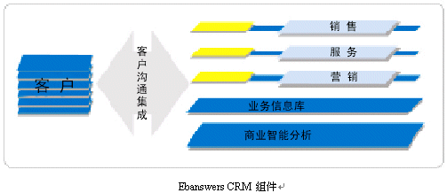 。。作為企業(yè)級客戶關(guān)系全面解決方案,Ebanswers CRM包含了可無縫整合又可獨(dú)立運(yùn)行的三個功能組件:銷售,營銷,服務(wù)流程自動化軟件系統(tǒng);客戶溝通集成信息化方案;深層商業(yè)智能分析。其中客戶溝通層組體是Ebanswers
