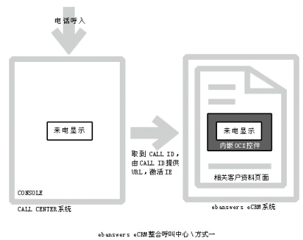 。。Ebanswers CRM整合呼叫中心的這種方式過程更清晰,當(dāng)有電話呼入系統(tǒng)時,由內(nèi)嵌的OCX控件取到call
