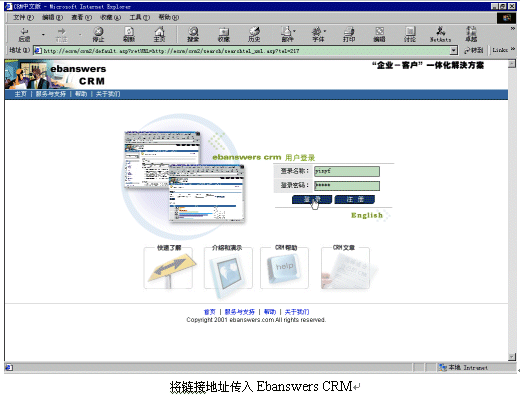 Ebanswers CRM系統(tǒng)去激活相關(guān)客戶資料的IE頁面進(jìn)行處理:如果此號碼數(shù)據(jù)庫中存在,則顯示此人的信息,如果不存在,則顯示CRM中添加新線索的頁面。而Ebanswers