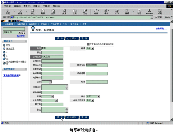 。。比如現(xiàn)在有一個新客戶黃航的電話13082856110呼入Ebanswers呼叫中心,console控制臺接收到這個電話號碼以后,會產(chǎn)生一個URL鏈接地址tel=217,以參數(shù)的形式附在調(diào)用的CRM頁面http://ecrm/crm2/default.asp?retURL=http://ecrm/crm2/search/searchtel_xml.asp后面,當(dāng)話務(wù)員登錄以后,就會彈出相應(yīng)的添加新線索頁面,話務(wù)員填寫好相關(guān)信息后,按下"保存"按鈕就可以建立新線索了。