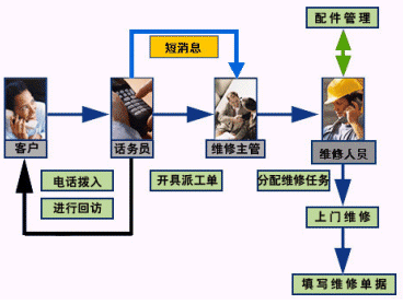后臺(tái)客服應(yīng)用子系統(tǒng)建成后,客戶的投訴被自動(dòng)導(dǎo)入,生成投訴單和維修單,自動(dòng)轉(zhuǎn)發(fā)給維修部,安裝部等專業(yè)部門進(jìn)行處理,處理完后,系統(tǒng)會(huì)安排話務(wù)員進(jìn)行回訪,消費(fèi)者的處理意見(jiàn)和滿意度將被忠實(shí)地記錄下來(lái),進(jìn)一步充實(shí)到客服數(shù)據(jù)庫(kù)中以指導(dǎo)企業(yè)的生產(chǎn)研發(fā)。
