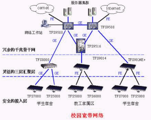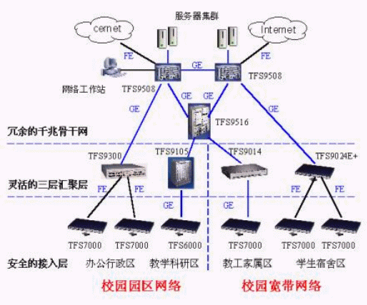 骨干交換機提供線速三層交換,接入層交換機線速二層交換保證全網無阻塞性能