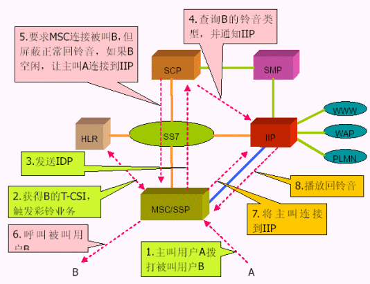 3. 智能網(wǎng)方式使用移動(dòng)智能網(wǎng)中的信令控制節(jié)點(diǎn)(SCP)實(shí)現(xiàn)智能業(yè)務(wù)的業(yè)務(wù)邏輯,新增的智能外設(shè)用于為用戶提供回鈴音和用戶管理功能。 個(gè)性化回鈴音業(yè)務(wù)是基于智能網(wǎng)系統(tǒng)的一個(gè)新業(yè)務(wù),在智能網(wǎng)中增加新的業(yè)務(wù)控制點(diǎn)(SCP)和獨(dú)立智能外設(shè)(IIP)。為此只需要為此業(yè)務(wù)加入基于Intel平臺(tái)的SCP和IP即可,前者是智能網(wǎng)體系中的業(yè)務(wù)控制設(shè)備,用于實(shí)現(xiàn)智能業(yè)務(wù)的業(yè)務(wù)邏輯,使用的是Intel高性能的c-PCI平臺(tái),支持高可靠性的冗余備份,提供業(yè)務(wù)呼叫控制和業(yè)務(wù)數(shù)據(jù)維護(hù)功能;后者是智能網(wǎng)獨(dú)立外設(shè),使用的是Inetl Dialogic的相關(guān)語(yǔ)音板卡,用于為個(gè)性化回鈴音用戶提供語(yǔ)音(回鈴音)、以及業(yè)務(wù)管理等功能。優(yōu)點(diǎn)是無(wú)須改動(dòng)現(xiàn)網(wǎng)上MSC/SSP 的軟件,通過采用SCP 查詢被叫用戶狀態(tài)的方式,只有當(dāng)被叫用戶處于空閑的情況下,才使用IIP 進(jìn)行處理,可以減少系統(tǒng)負(fù)荷,降低SSP 與IIP 之間話路的占用。缺點(diǎn)是需要MSC支持智能網(wǎng)業(yè)務(wù)。