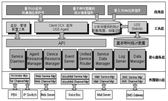 青牛USE從體系結(jié)構(gòu)上分為四個層次。第一層為外圍接口層,負(fù)責(zé)接入、抽象和發(fā)布來自不同渠道的服務(wù)請求;第二層是核心服務(wù)層,它是青牛USE軟件的核心部分,對來自不同渠道的服務(wù)請求和服務(wù)回復(fù)進(jìn)行統(tǒng)一的服務(wù)排隊管理、資源調(diào)度管理、日志數(shù)據(jù)管理等,屏蔽了不同渠道的物理特性,真正實(shí)現(xiàn)統(tǒng)一路由、統(tǒng)一管理;第三層是工具層,是青牛USE提供給應(yīng)用開發(fā)商和集成商的開發(fā)接口和配置工具;第四層,USE產(chǎn)品的應(yīng)用層,為呼叫中心應(yīng)提供應(yīng)用功能,比如:呼叫統(tǒng)計分析、呼叫監(jiān)控等。