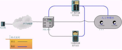 上圖是客服中心較常見的結(jié)構(gòu)圖,相當(dāng)于將初級客服的CT-Server服務(wù)器一分為三。原來的語音板卡由現(xiàn)在真正的PBX替代,青牛USE和青牛ATS則是從CT-Server軟件包中獨立出來,強(qiáng)化各自的核心功能,運行在兩臺單獨的服務(wù)器上(IVR服務(wù)器還是需要語音板卡來處理話路,但語音板卡已經(jīng)不負(fù)責(zé)PBX的交換功能了)。這種類型的客服中心可以給客戶更大規(guī)模的、更穩(wěn)定的服務(wù),并且撥入電話的客戶感覺不到系統(tǒng)的變化。