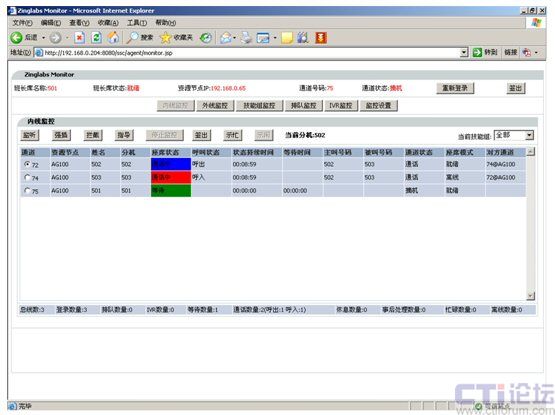 3.模塊界面劃分清晰:Monitor監(jiān)控模塊分為內(nèi)線監(jiān)控、外線監(jiān)控、虛通道監(jiān)控、技能組監(jiān)控和IVR監(jiān)控共五大類。各類別功能獨(dú)立運(yùn)行,可根據(jù)企業(yè)對(duì)聯(lián)絡(luò)中心班長(zhǎng)的職責(zé)劃分,對(duì)各類技能組、項(xiàng)目組的班長(zhǎng)登錄提供有區(qū)別的監(jiān)控頁(yè)面,從而為每位班長(zhǎng)的恪盡職守提供了良好的保證。
