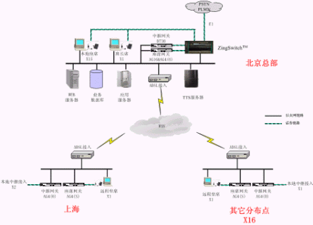 系統(tǒng)在北京總部部署了一套英立訊的ZingSwitch一體化交換機(jī),采用高度集成的ALL-IN-ONE方式提供了PABX、ACD、CTI