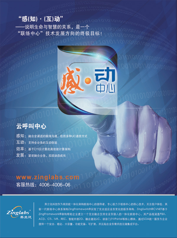 英立訊科技(Zinglabs)是國際領(lǐng)先的高效能一體化聯(lián)絡(luò)中心平臺(tái)及CTI解決方案提供商。一直秉承“創(chuàng)新設(shè)計(jì)、追求卓越”的理念,為其用戶和合作伙伴開創(chuàng)著一個(gè)無限豐富、靈活的平臺(tái)空間。英立訊科技的產(chǎn)品會(huì)幫助企業(yè)建立一個(gè)完全融合的支持全媒體接入的一體化聯(lián)絡(luò)中心,為企業(yè)提供一個(gè)安全、可靠、大容量、功能完備、可擴(kuò)展,并且與企業(yè)業(yè)務(wù)系統(tǒng)無縫集成的技術(shù)平臺(tái)。公司專心致力于CTI領(lǐng)域,是專注于CTI技術(shù)并引領(lǐng)相關(guān)技術(shù)走向的聯(lián)絡(luò)中心平臺(tái)專業(yè)化廠商,在一體化架構(gòu)聯(lián)絡(luò)中心產(chǎn)品的完善和提高方面不斷努力創(chuàng)新,為客戶定制隨需應(yīng)變的聯(lián)絡(luò)中心平臺(tái)。