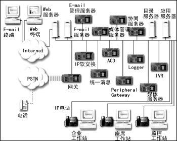 從上面的圖1、圖2中,可以看到IP通信大大簡(jiǎn)化了企業(yè)的網(wǎng)絡(luò)通信結(jié)構(gòu)。但是為了實(shí)現(xiàn)不同的功能和應(yīng)用,網(wǎng)絡(luò)中仍然存在很多的服務(wù)器,各個(gè)品牌不同功能的服務(wù)器之間的協(xié)同成為最顯著的問(wèn)題,同時(shí)維護(hù)和運(yùn)行這樣大量的設(shè)備也需要大量的資源支持。而且,這僅是單點(diǎn)的客戶(hù)服務(wù)中心所需的配備,而在基于IP通信的分布式客戶(hù)服務(wù)中心的構(gòu)建中,所涉及的設(shè)備更多。
