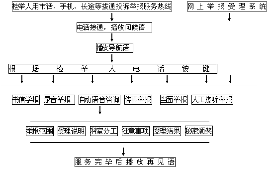 本系統(tǒng)充分借助計算機及通迅線路的優(yōu)勢,將高度普及的電話線路,同高科技的計算機處理緊密結合起來,通過電話語音這一人類最易溝通交流的途徑和手段,將檢舉人和檢察院緊密結合起來。檢舉人通過簡單的拔通服務電話,使用電話按鍵,利用自動語音導航和人工服務,實現(xiàn)以上熱線投訴舉報的自動咨詢及人工服務的各項功能。