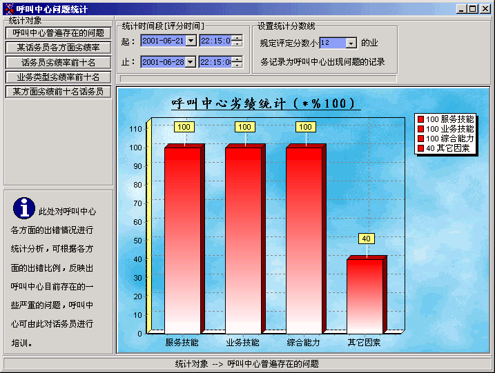 下圖為AP Suite的呼叫中心劣績(jī)統(tǒng)計(jì)圖,通過此統(tǒng)計(jì)可以了解到呼叫中心目前存在的一些問題,從而對(duì)話務(wù)員進(jìn)行針對(duì)性的培訓(xùn)。