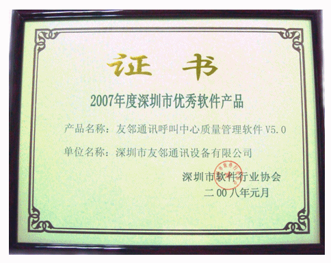 2008年3月14日,深圳市友鄰?fù)ㄓ嵲O(shè)備有限公司(以下簡(jiǎn)稱“友鄰?fù)ㄓ崱保┬,公司主打軟件產(chǎn)品“友鄰?fù)ㄓ嵑艚兄行馁|(zhì)量管理軟件V5.0”(即 AP Suite 呼叫中心質(zhì)量管理系統(tǒng)V5.0)榮獲深圳市軟件行業(yè)協(xié)會(huì)“2007年度深圳市優(yōu)秀軟件產(chǎn)品”榮譽(yù)稱號(hào)。