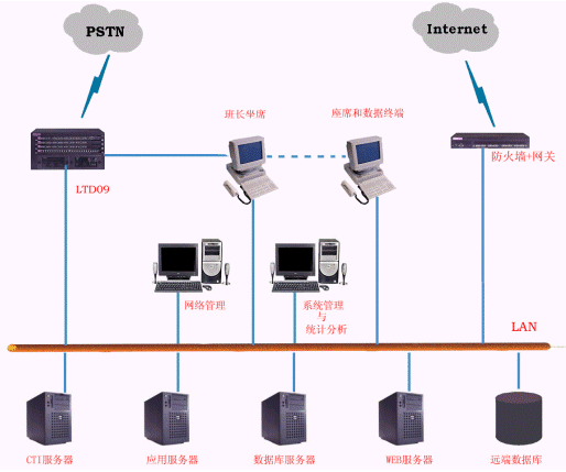 LTD4000客戶服務(wù)中心主要由LTD-09可編程智能語音交換機、業(yè)務(wù)代表座席、CTI服務(wù)器、數(shù)據(jù)庫服務(wù)器、WEB服務(wù)器、管理監(jiān)控工作站和網(wǎng)絡(luò)連接設(shè)備等部分組成。