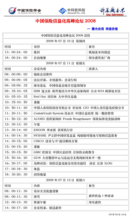 7月10日至12日, 中國保險(xiǎn)信息化高峰論壇2008將于北京順義區(qū)喬波國際會(huì)議中心盛大舉行, 此次大會(huì)的邀請(qǐng)來賓有包括中國人保,太平保險(xiǎn),中國人壽,中國太平洋保險(xiǎn),華泰保險(xiǎn),陽光財(cái)險(xiǎn)等保險(xiǎn)業(yè)的最優(yōu)秀的企業(yè)。億迅作為最佳廠商之一,也得到該會(huì)主辦方的盛情邀請(qǐng),屆時(shí)將與各大保險(xiǎn)企業(yè)技術(shù)主管,保險(xiǎn)公司副總經(jīng)理,保監(jiān)會(huì)相關(guān)領(lǐng)導(dǎo)以及資深保險(xiǎn)行業(yè)信息化建設(shè)專家共同聆聽來自保監(jiān)會(huì)領(lǐng)導(dǎo)的指導(dǎo)性意見,交流重要企業(yè)的優(yōu)秀解決方案,分享系統(tǒng)集成商的最直接方案對(duì)比。會(huì)議期間,億迅公司大中華區(qū)執(zhí)行副總張佑佶先生將有一個(gè)演講時(shí)段,與保險(xiǎn)業(yè)的新老朋友共同研討“呼叫中心信息化在兩岸三地的魅力趨勢(shì)”,全情期待中……