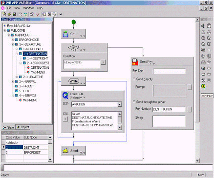 為了最大限度地方便用戶, Visual Editor 為 IVR 腳本的編寫提供了一整套可視化的圖形工具. 在它的集成開發(fā)環(huán)境中, 你可以執(zhí)行定義一套語音文件, 定義和初始化一些變量, 定義 DSN 和一些記錄集, 加入新結點等操作.