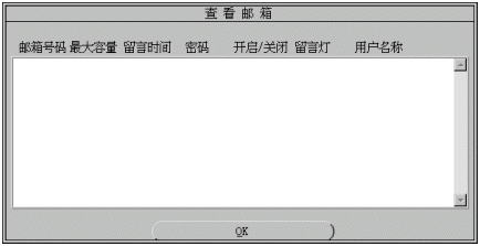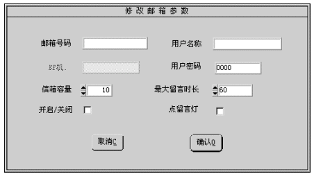 1). 您可修改的參數(shù)有:用戶名稱、用戶密碼、信箱容量、最大留時長、開啟/關(guān)閉、點(diǎn)留言燈。有關(guān)參數(shù)的細(xì)節(jié)將在增加信箱一節(jié)中介紹。