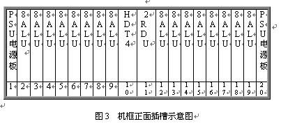 見(jiàn)圖2和3,遠(yuǎn)端模塊采用19英寸標(biāo)準(zhǔn)機(jī)框,高度為5U,可安裝在各種標(biāo)準(zhǔn)的19英寸的機(jī)柜中。機(jī)框共20個(gè)插槽,正面插板,反面背板出線。每個(gè)機(jī)框可插20塊各種類型的板件,其中兩邊第1第20槽固定插電源板PSU,中間第10號(hào)槽固定插數(shù)字中繼接口板HDT4,其余16個(gè)槽為通用槽口,可插16塊各種類型接口板。每塊板為8路,一個(gè)機(jī)框總共128話路。調(diào)度接口板2RDU固定插第11槽,該板不占機(jī)框端口。對(duì)于自帶交換系統(tǒng),需要安裝一塊系統(tǒng)信號(hào)音板8TDU,該板固定插19槽,占8個(gè)端口。