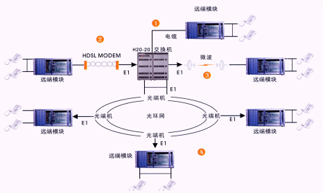 遠(yuǎn)端模塊通過(guò)標(biāo)準(zhǔn)2M(E1)接口與交換機(jī)連接。該接口不受傳輸距離和傳輸設(shè)備的限制。常用的傳輸設(shè)備有SDH、PDH光端機(jī)(光纜),數(shù)字微波、數(shù)字?jǐn)U頻,HDSL調(diào)制解調(diào)器(雙絞線)等。